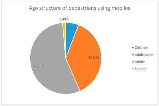 4]. The results indicate that of the entire population almost 5% of pedestrians wear headphones. Regarding mobile phone usage, this percentage fluctuated around 10% of all people using the analyzed pedestrian crossings. It was also found that pedestrians use mobile phones much more often on pedestrian crossings with traffic lights than on pedestrian crossings without traffic lights.