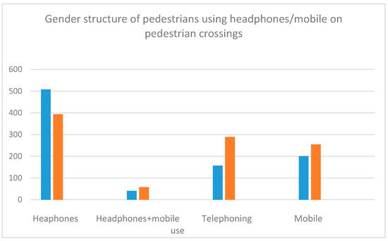 Figure 4 shows the distribution of headphone and mobile phone use by pedestrian gender. Of the total number of 902 pedestrians who used headphones at the crossings, 508 (56.32%) were men and 394 (43.68%) were women. In the other categories, however, women predominated, with the biggest difference being for pedestrians who were making phone calls. Of the total number of 446 pedestrians who were telephoning, 289 (64.8%) were women, compared to 157 (35.2%) men.