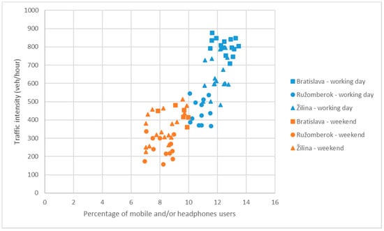 Figure 5 describes correlation between the traffic intensity (volume of vehicles that passed observed pedestrian crossings) and the percentage of pedestrians who used a mobile phone and/or headphones (from all the persons observed at pedestrian crossings) during the implementation of the present study.