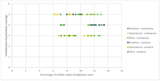 Figure 6 describes the relation between the level of visibility assigned to each pedestrian crossing and the percentage of pedestrians who used mobile phones/headphones during observations on weekdays (diamond sign) and weekends (round sign). Similar results were identified at pedestrian crossings with different visibility levels (e.g., from 10.8 to 12.1% of mobile/headphones users were observed at pedestrian crossings with visibility levels 3, 4 and 5). From the presented results, we can conclude that the level of visibility of individual pedestrian crossing from the driver’s point of view does not affect the behavior of pedestrians.