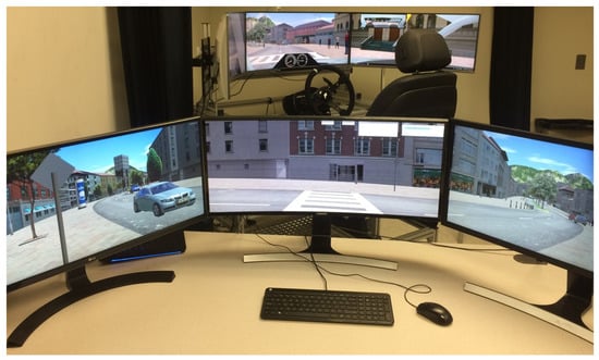 The pedestrian simulator in this setup was used to manually control pedestrians within the simulated environment where the participant was driving. The control station for the pedestrian simulator consisted of three monitors, which provided a 180° view into the virtual world from the perspective of the pedestrian. The central monitor was a Samsung 24-inch LCD monitor with a resolution of 1920 × 1080 pixels, the monitors on the left and right sides were 32-inch Samsung LCD monitors with a resolution of 3440 × 1440 pixels. A trained research assistant used a keyboard to control the movements of the human-controlled pedestrian, including head turning and walking. During the simulation, the assistant controlling the pedestrian and the participant driving the virtual vehicle were not able to see each other outside of the simulated environment. Thus, the assistant could see neither the participant nor the participant’s view of the road and could only use information from the pedestrian’s view in the virtual world.