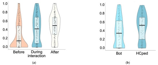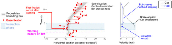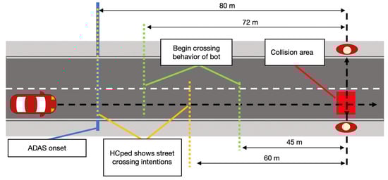 Figure 5 right). Then, each event was divided into three time intervals: (1) the time directly prior to the interaction (pre); (2) the time during which the pedestrian was indicating the intention to cross, defined as the interaction (during); and (3) the time after the interaction (post). The first interval (pre) started at the point in time where the ADAS warning was either given (ADAS enabled) or would have been given (ADAS disabled). There was no actual movement of the pedestrian during this interval. The first interval ended and the second interval (during) started when the pedestrian made the first step toward the road, indicating the intention to cross. Once the Bot made the first step, it then continued walking without stopping, whereas the HCped stopped at the edge of the road, looked toward the car’s direction, and then either walked across the road or stayed on the sidewalk. Whether it stayed or walked depended on the human operator’s assessment of the safety of the planned crossing. The second time interval ended when the Bot or HCped took the first step onto the road. The third time interval (post) started at the end of the second time interval but was only defined for those situations where the pedestrian crossed the road without a collision. This time frame visualizes the section from the first step of the pedestrian onto the road until the driver started to accelerate the car after the pedestrian had crossed the driver’s travel lane.