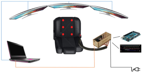 20]. The vibration strength and duration were selected in pilot trials to provide a vibro-tactile warning of sufficient intensity and duration to be easily felt when sitting on the seat cover but not too strong as to be uncomfortable. A scheme of the driving simulator system and the connections are shown in