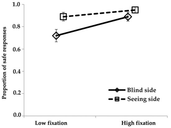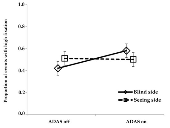 When driving without the ADAS engaged, HVFD participants had higher rates of unsafe crossings for pedestrians that started on their blind than seeing side (36% and 3%, respectively). However, when the ADAS was engaged, then crossings from the participants’ blind sides were as safe as from their seeing side. Consistent with our hypothesis, these findings indicate that the benefit of the ADAS on participants’ safety rates was greater on the blind side compared to the seeing side. With an engaged ADAS, participants were alerted that they needed to make a scan to the blind side to look for a potential hazard on that side. Thus, they fixated the pedestrians more on the blind side when the ADAS was engaged than when it was off, and there were fewer unsafe crossing situations. When the ADAS was off, HVFD participants spent a greater proportion of time looking at pedestrians on the seeing than on the blind side. However, when the ADAS was engaged, there was an increase in the proportion of time fixating pedestrians on the blind side but not the seeing side, providing direct evidence of the beneficial effects of the vibro-tactile cue in acting as a guide to warn HVFD drivers when they needed to make a scan to the blind side.