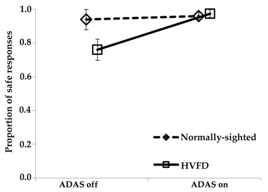 The HVFD sample size of this proof-of-concept study was relatively small with only eight participants, and only one of them was a current driver. Differing characteristics of the visual field loss (hemianopia vs. quadrantanopia) and other individual factors such as age and the length of time since they last drove might have influenced scanning behaviors and the ADAS effects. Thus, participant was included as a random effect in our models. However, we did not have a sufficiently large sample size to separately evaluate the effects of individual factors. Nevertheless, our sample size was sufficient to provide evidence of the beneficial effects of the ADAS on responses to blind side hazards.