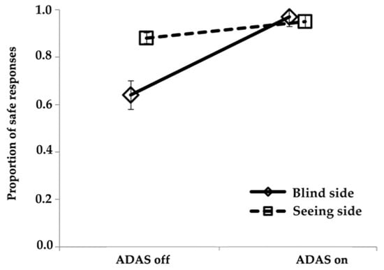 27]. Any interactions between ADAS, crossing side, and pedestrian type were examined by model comparisons. For each interaction, a baseline model without interactions was compared with the same model, including the interaction of interest using analyses of variance (ANOVAs). The significance of the interaction of interest is represented by the resulting χ