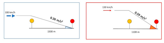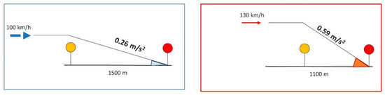 2 would be sufficient to stop in front of the red signal, while in the situation on the right, a deceleration rate of 0.59 m/s