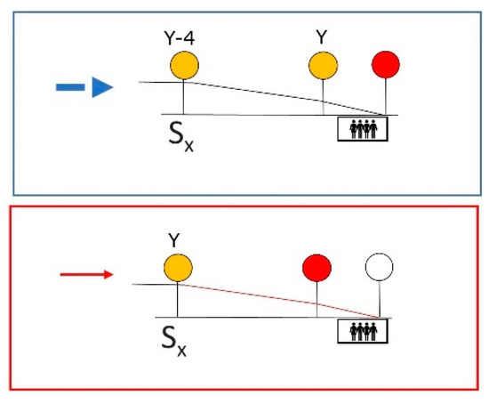 Figure 4 shows that signal Sx can have signal aspect yellow:4, as part of a yellow:4 yellow–red sequence. It can also have a yellow aspect as part of a green–yellow–red sequence.