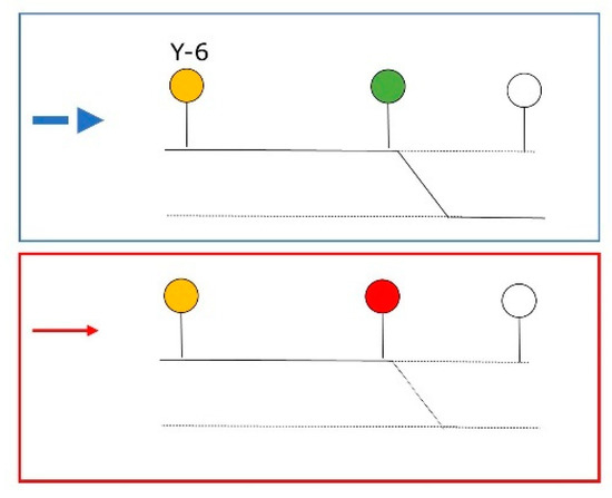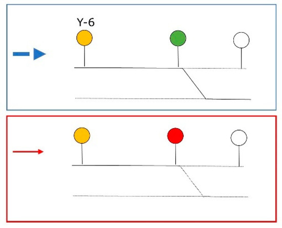 Figure 6, the standard, more common situation is visualized at the top (blue). Below this is the deviating situation (red). In this scenario, the signal aspect and location are exactly the same during both approaches.