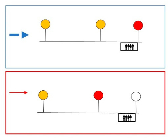 Figure 7). The standard, more common situation is shown at the top (blue). Below this is the deviating situation (red). In this scenario, the location is exactly the same during both approaches and the signal aspect is visually similar.