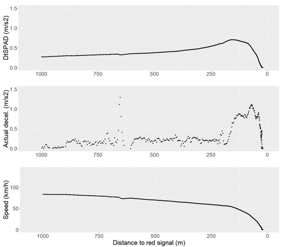 /distance to red aspect, where speed is measured in meters per second and distance in meters. The DtSPAD indicates the deceleration rate the train needs to maintain to be able to stop exactly at the red signal. The maximum value of these is the mDtSPAD. In