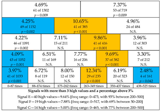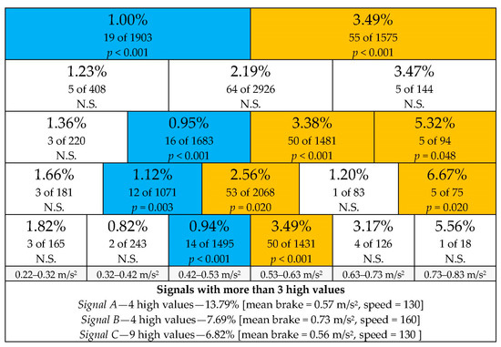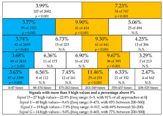 It is possible that there are signals which have many approaches with high values. If the results are fully attributable to one or a few signals, the results are less likely to be caused by the investigated variable. To check whether the results were not fully attributable to one or a few signals, signals with more than three high values were identified. These signals are listed in the tables in the Results section and have been used to interpret the results.