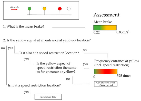 To test the speed restriction effect, approaches were selected where there were speed restrictions via yellow–x and a specific mean deceleration range. Locations with entrance at yellow were excluded (n = 509 red aspect approaches).