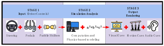 The accompanying simulation software environment was developed in-house (using C++) so that its design could be tailored to exact training needs. While participating on the simulator, the driver adjusts the on-board Human Interface Devices (HID) controls (Stage 1), and these inputs are then delivered to a Windows-based workstation where a simulation analysis is performed (Stage 2). Physics-based model changes manifest themselves in required updates to three forms of output rendering: (i) the scene graphics state (Stage 3a), (ii) the motion platform state (Stage 3b), and (iii) the audio state (Stage 3c) of the simulation. Notionally, this signal path is illustrated in Figure 4, whose design and implementation has previously been described elsewhere [33]. Each of these primary I/O states are briefly described.
