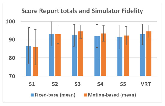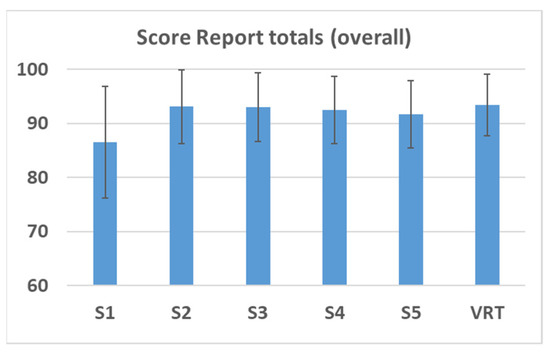 Frequency histograms were composed to illustrate score report total scores as collected and calculated by the computational engine of the driving simulator. These data are representative of core safe driving performance skills as programmed and monitored in real-time by the simulator (e.g., travel speed and behavior at intersections). Refer to Figure 11, which plots the average cohort total score on the x axis for each of the five training sessions (S1–S5), as well as the virtual road test (VRT) on the y axis. The figure demonstrates a general overall compliance to safe driving habits within the simulator; however, it indicates that there may be a ceiling effect beyond the first session. For the remainder of the sessions, ratings from the score report were biased toward the upper threshold of the rating scale, which is a direct indicator of expected improvement of cohort core driving skills (with continued practice/exposure). This trend culminated with the virtual road test, where observed (mean) cohort scores were the highest when compared against any of the training modules offered within each of the simulator training sessions. Embedded within each series are the corresponding standard deviations for these scores report total scores. As expected, there was a wider standard deviation for the first session; however, these deviations slowly and steadily reduced as training progressed, culminating with the smallest standard deviation for the virtual road test. This is a likely indicator that positive training was maintained and actually improved as the program progressed, as scores tended to increase more uniformly (i.e., with less variation) for the entire training cohort.