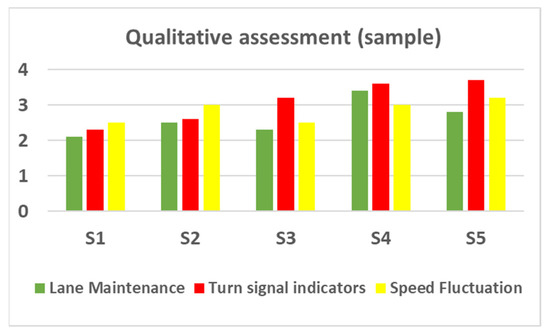 Although quantitative measures served as the primary mechanism for trainee performance assessment, training evaluators also performed a more subjective qualitative assessment (upon pairs of trainees) during each instructional session. In this way, certain categories of trainee performance could be monitored and measured that would be more challenging to program a simulator to quantify with any meaningful accuracy. In so doing, it helped us to maintain an ever-critical “human-in-the-loop” as a critical constituent of the overall human performance assessment. To this end, Figure 13 presents an example depiction of the qualitative assessment for a single participant, in the form of an instructor evaluation checklist (IEC). The IEC was performed across three qualitative performance categories, each rated on a (0–4) Likert scale and observed over the five primary instructional sessions. The categories represent an assessment of (a) overall lateral lane stability, (b) vigilance for using turn signals to indicate turns and lane changes, and (c) maintaining appropriate speed/distance specifically amidst the “challenge” segments of the training modules. For this particular trainee (sample), overall, qualitative ratings generally improved across the five training sessions—particularly, compliance to “turn signal indicators”, which demonstrated steady improvement across all five sessions.