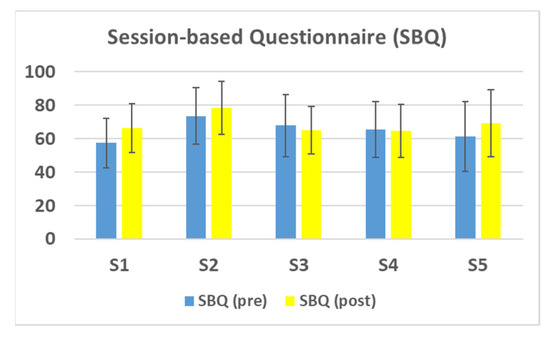 As a tertiary mechanism for the holistic driver performance evaluation, quantitative and qualitative measures were supplemented with a series of self-report metrics. An overall data comparison found that post-SBQ scores were improved (with significance) as compared to the pre-SBQ scores, (t(132) = +3.64, p = 5.19 × 10−9). Figure 15 plots the results (pre vs. post) of the session-based questionnaire (SBQ) cohort average across each of the five instructional sessions. When individual sessions were compared, the post-SBQ scores were higher (with significance) than pre-SBQ scores for three of the five instructional sessions: Session 1, t(132) = +8.89, p =3.18 × 10−11; Session 2, t(132) = +5.00, p = 6.02 × 10−5; and Session 5, t(132) = +7.92, p = 2.24 × 10−7. The lack of observed improvement for the other two individual sessions (i.e., Sessions 3 and 4) could indicate that there was not sufficient correlation between the content of the questionnaires and the embedded training content within the simulator exercises designed explicitly as the focal point for those sessions.