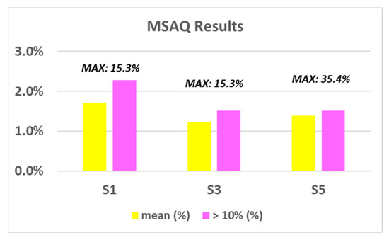 The Motion Sickness Assessment Questionnaire (MSAQ) was issued post-simulator in Sessions 1, 3, and 5. An overall evaluation found that, as expected, simulator sickness was not identified to be a primary concern for these simulator experiments that were designed and deployed for this young driving cohort. Figure 16 displays the cohort mean score (reported as a percentage of the overall MSAQ score: 144) and the number of participants who reported cumulative scores of greater than 14 (15) of the total MSAQ scale (also reported as a percentage of the total N = 132 cohort). Standard deviations for the three sessions (1, 3, and 5) were significantly large only relative to the reported means; they were 2.56%, 2.55%, and 4.44%, respectively, which is an indicator that there was a comparatively wide dispersion of results. To this point, note that Figure 16 also displays a maximum (MAX) MSAQ score across the cohort for each of the three sessions in which this metric was collected and analyzed. While the extremes are noteworthy outliers, the overall trends of the data are favorable. The low MSAQ scores across the cohort are attributed to the youthful age demographic (14–17), who are rarely susceptible to anything more than “mild” simulator maladaptation. The experimental design (see Table 2) successfully imparted simulation best-practices and intentionally balanced the 2 h training sessions with breaks, timely transitions between driver/passenger activities, video training, survey activities, and perhaps most critically—simulator experiment durations that fell below a 15 min maximum.
