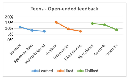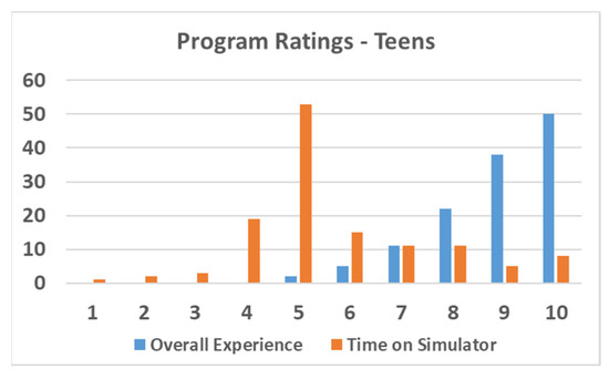 As a primary segment of teen (and parent) surveys, attempts were made to better understand elements of the current simulator framework that demand improvement in future implementations. Many teens suggested that signs and lane markings were difficult to see; although every attempt was made to ensure clarity and visibility of simulation environment objects, improvements are still required. Many teens suggested that the simulator (steering/pedals) were difficult to operate; this remains a common complaint across all driving simulators—particularly so with the feel of the brake pedal [52]. It is never feasible to make a simulator “feel” like everyone’s own vehicle, both physically (e.g., the resistive force on the brake pedal) and visually (e.g., the reduced sensation of longitudinal motion—or vection [53]—while braking within a virtual environment). Nonetheless, ongoing improvements including additional acclimation and device “tuning” to each driver should be considered. Finally, various teens (and parents) suggested the need for improved simulator graphics/realism toward a modern-day “gaming” standard.