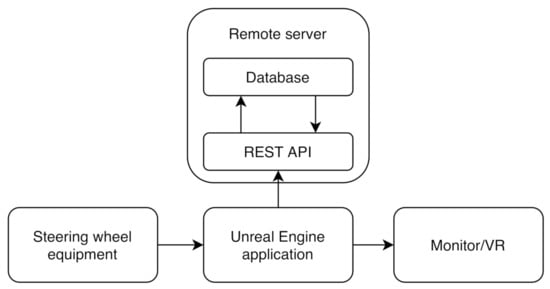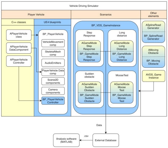 The structure of the Vehicle Driving Simulator (VDS) is detailed in Figure 2. For this research, we utilized the Unreal Engine 4 (UE4) framework, that is, a game engine. The main benefit of the approach consists in that the framework establishes a set of base functions and an environment in which the developers can easily implement controllable objects, scenario/application behavior, and back-end data processing.