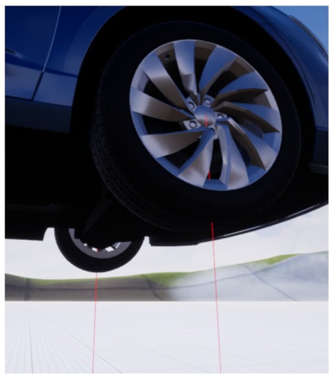 We use a Logitech G920 Driving Force steering wheel, which supports the force feedback. Using the Logitech SteeringWheelSDK, the force feedback is applied on the steering wheel, based on the physical material of the terrain the vehicle is currently moving on. The amount of force applied through multiple effects is determined by the combination of physical materials returned from each ray cast (a vector with pre-specified starting and ending points in 3D coordinates that returns the first object it collides with [], as shown in Figure 4).
