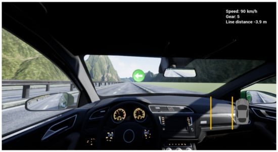 The scenario relies on a long highway loop, which takes approximately 15 to 25 min to pass through (depending on the maximum velocity set on the vehicle). The only task is to complete the ride multiple times while attempting to stay in the same lane; if the car deviates excessively from the lane, a visual warning appears (as seen in Figure 5 in form of car deviating from the lane), urging the driver to manage the situation. Such a configuration simulates a long highway drive, in which fatigue and drowsiness are highly probable.