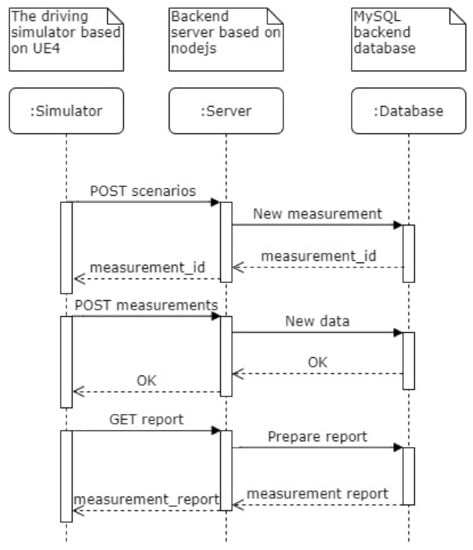 The backend server needs to manage the request calls; for this reason, the designed REST API delivers appropriate commands, collecting the measured data and retrieving them in a structured form. Furthermore, the server requires a flow of measuring operations, as visualized below. At the beginning of a measurement cycle, the server is asked to create a new measuring scenario record (via a related post command) containing a link to the scenario type, person, and prior Google questionnaire. Then, the simulator can post the measured data in chunks, that is, more measured points in one message. When the measurement has ended, the server provides a structured report using a GET command. The presented flow (Figure 7) is assumed to be used daily; in addition to the flow, the REST API ensures other standard commands, too. All of the provided requests are summarized below, reading: