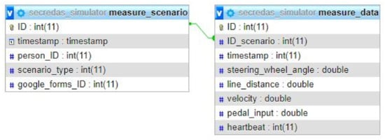 In order to analyze the measured data, a data model was created to arrange into an organized structure the input variables and data of a driver and a vehicle, respectively. The data model (Figure 8) of the remote database follows the measure scenario concept, which comprises the bunch of the currently measured data and the actual measurement mode. The measure scenario utilizes one of the pre-defined scenarios available in the simulator and is specified in greater detail by the measurement conditions.