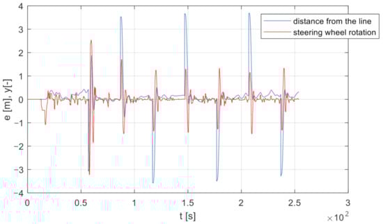 An example of measured data (relating to the Highway: Step Response scenario) is shown in Figure 9, where a link between the line distance and the steering wheel rotation can be identified. The driver responds to a sudden lane change event with a variable reaction delay; nevertheless, after the initial two control actions, a certain driver behavior pattern is observable. These measured data are then employed to evaluate diverse parameters defining the driver’s behavior in a concrete situation under particular conditions.
