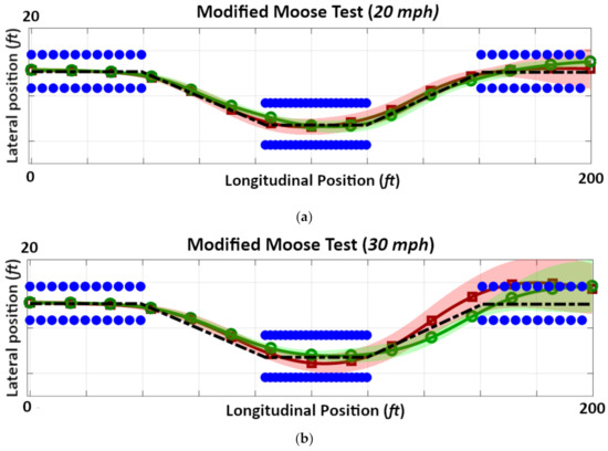 In critical instances when drivers face unusual or hazardous driving conditions (e.g., inclement weather, high speeds, bumpy roads, vehicle malfunction, evasive reactions to sudden lateral events), we expect our vehicles to respond predictably and safely—and as advertised by the manufacturer. Before a vehicle is available on the market, it has to be tested in extreme conditions to ensure that no manufacturing defects or engineering design miscalculations (e.g., structural, aerodynamic) will result in unsafe or unpredictable performance. The Moose Test is a prime example of a proving ground evasive maneuver [40] and was conceived and configured to evaluate vehicle tilt stability (i.e., resistance to rollovers) and related handling performance, which play a critical role in assessing vehicle design and safety [41]. To standardize and simplify this lane change maneuver, the Association of the German Automotive Industry (VDA) revised the Moose Test, and transferred it to the International Standard ISO 3888-2 [42] allowing for reproducible test results. Refer to Figure 9, which illustrates an actual ISO 3888-2 Moose Test experiment as performed by the Nissan Corporation.