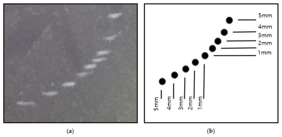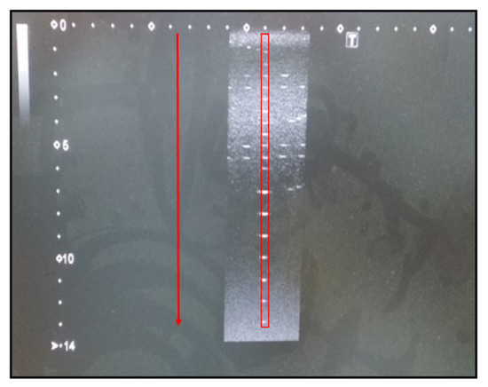 The resolution test examines the spatial resolution of the ultrasound transducer by checking whether two distinct reflectors laying in the direction of ultrasound can be distinguished by the naked eye. Vertical resolution refers to the ability to distinguish between two reflectors that lay in front of and behind each other in the direction of ultrasound propagation, whereas horizontal resolution refers to the ability to distinguish between two reflectors that lay next to each other. A group of nine reflectors are placed in pairs 5, 4, 3, 2, and 1 mm apart, where those close to the transducer have a wider separation (Figure 3). All reflectors must be clearly distinguished. The vertical and horizontal resolution should be less than or equal to 2 mm or 3 mm, respectively, or satisfy the values suggested by the manufacturer. Our results show that both the vertical and horizontal resolutions were approximately 1 mm, which satisfied the range of the reference values.