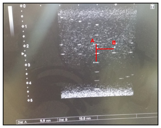 The distance accuracy test measures the vertical and horizontal target distance to the beam axis and checks whether a device accurately measures the size and volume of a given structure. Ultrasound images are acquired by adjusting the position and angle of the transducer during a diagnostic ultrasound and selecting two points of the vertical and horizontal distance inside the phantom. The vertical and horizontal distances are measured using the diagnostic ultrasound measuring equipment. In order to pass the test, the distances should be within ±5% of the reference value or within 1 mm. Figure 5 demonstrates that the measured value in our study matched the reference value (10 mm).