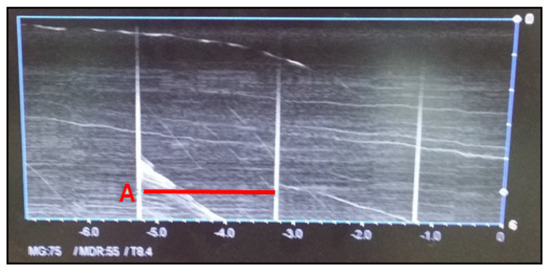 The maximum display depth is also known as sensitivity and is used to evaluate how deeply a medium can be penetrated when ultrasound propagates. The performance of the ultrasound device is evaluated by testing the penetration depth in an anechoic structure. Figure 4 shows the penetration depth of an abdominal ultrasound. The vertical axis of Figure 4 is in centimeters. In our study, it was larger than the reference value (80 mm).