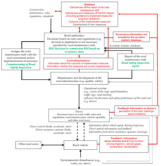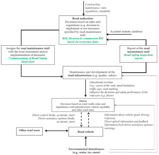 The road authorities conduct maintenance activities and enforce the applicable laws, standards and guidelines according to the commissioning. A distinction is made as to whether the road maintenance process takes place on its own (black/bold) or whether an RSI (green/bold and italic) was commissioned on the basis of accident “black spots”. The road authorities receive reports from the road maintenance staff and the road safety inspector. In addition, the road authorities receive information about accidents from a statistical database. If an RSI is commissioned by the road owner, the road owner decides if the measures recommended by the RSI report will be implemented by the maintenance staff. The road infrastructure affects the driver through the road, traffic signs, lane markings, etc. and the driver himself steers, brakes or accelerates the vehicle accordingly. The driver receives information and feedback about the road infrastructure, driving trajectory, driving speed. In addition, the driving environment (e.g., weather conditions) influences both the driver and the road infrastructure. In the current applicable standards, information about both vehicle and driver needs is not mandatory required from the RSI.