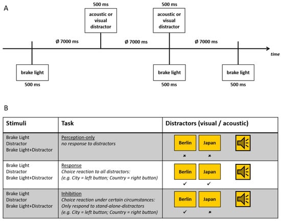 Depending on the instruction, the participants should (a) ignore the distraction stimuli completely (perception-only task), or (b) react to each distraction stimulus by pressing a left button (as response to a country name) or right button (as response to a city name or vice versa) on the steering wheel (response task). In the third task, participants should (c) only react to the distraction stimulus in the described way if it occurred alone, but should ignore it when it was presented in combination with the brake light (inhibition task, see Figure 2B for an overview of the tasks). In any case, according to the instructions, the driving task (steering and braking), as in real life, had a higher priority than the secondary task (responding to distraction stimuli).
