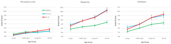 Mean braking RTs and standard errors of mean in trials with single brake light (BL), brake light + acoustic stimulus (BL + acous), and brake light + visual stimulus (BL + vis) of the four age groups, presented separately for perception-only, response, and inhibition task.