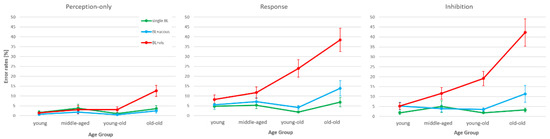 Error rates and standard errors of mean in trials with single brake light (single BL), brake light + acoustic stimulus (BL + acous) and brake light + visual stimulus (BL + vis) of the four age groups, presented separately for perception-only, response and inhibition task.