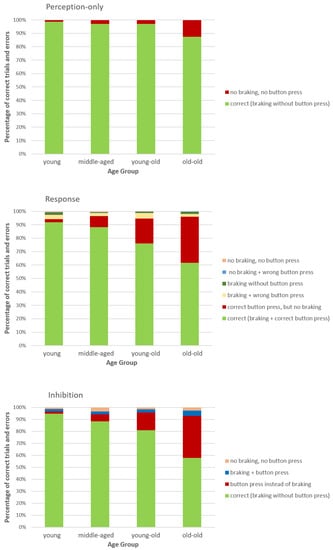 Proportion of correct braking reactions and various types of errors in percent, presented separately for perception-only, response and inhibition task and the four age groups. Please note especially the age-related increase in the proportion of errors, in which the correct response to the distraction stimulus was given, but the brake response was omitted (red bars in response and inhibition).