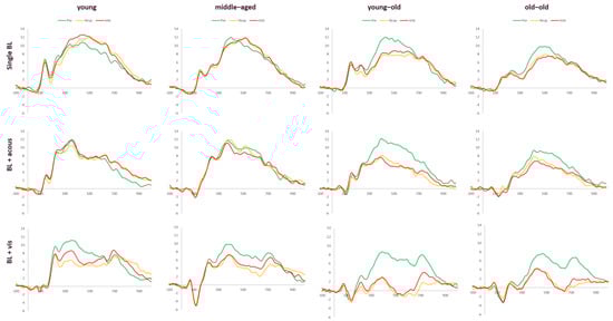 In order to account for the fundamental neurophysiological differences in the processing of single stimuli and stimulus combinations of different modality, EEG data were analyzed separately for the different stimulus types (single brake light vs. brake light + additional acoustic stimulus vs. brake light + additional visual stimulus). Thus, separate ANOVAs were conducted for the three stimulus combinations with the within-subject factor Task (perception-only vs. response vs. inhibition) and the between-subject factor Age (young vs. middle-aged vs. young-old vs. old-old).