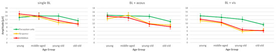 In summary, the reduction of P3b amplitude task in response and inhibition tasks (relative to perception-only task) was more pronounced with brake lights with acoustic or visual distracting stimuli than with single brake lights. Additionally, irrespective of stimulus, this reduction of P3b amplitude in response and inhibition tasks (relative to perception-only task) was more pronounced in the two older age groups.