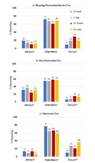 Proportion of participants reporting safety behaviors such as hearing protection device, eye protection, and sunscreen use when performing agricultural tasks. Note: U-Female = University female; U-Male = University male; CC-Female = Community College Female; CC-Male = Community College Male. * Indicates differences between male and female responses, using a 2 proportions Z-test (p ≤ 0.05); † Indicates differences between university and community college responses, using a 2 proportions Z-test (p ≤ 0.05).
