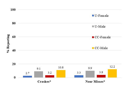Proportion of participants reporting “near-miss” incidents and crashes while operating farm equipment on roadways. Note: U-Female = University female; U-Male = University male; CC-Female = Community College Female; CC-Male = Community College Male. * Indicates differences between male and female responses, using a 2 proportions Z-test (p ≤ 0.05).