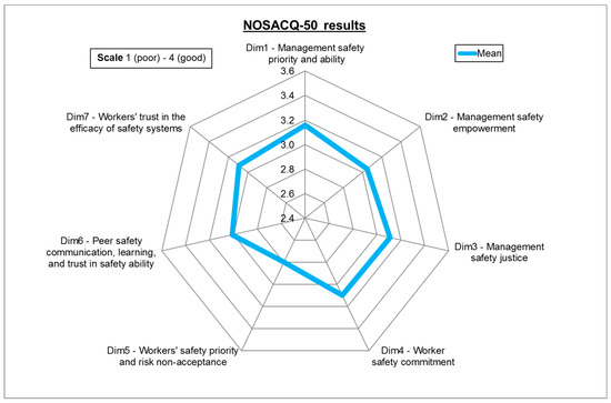 - Dim4—Workers’ safety commitment: 6 items to estimate the perception of workers’ commitment to safety;