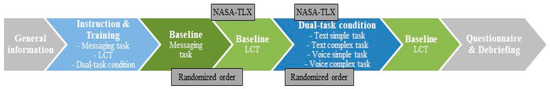 Figure 3 displays the procedure of the experiment. First, potential participants were informed about the experimental goals and procedures. If the participants provided their informed consent, they were familiarized with the setup and received instructions for the different tasks. Second, participants received task instructions and a training session to ensure familiarity with the setup and tasks. The training sessions contained the messaging task, the LCT and the dual-task condition (messaging task and LCT simultaneously). Third, baseline runs were conducted for the messaging task and the LCT. The order of the letter strings that had to be repeated while answering messages was standardized for each task condition. The order of blocks for the baseline runs was randomized. The baseline runs allowed comparability with performance during the dual-task condition.