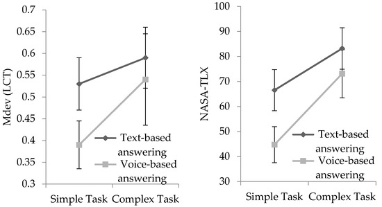 Figure 4. Main and interaction effects of mean deviations in the LCT (left) and NASA-TLX scores (right) for text- vs. voice-based answering in simple vs. complex tasks.