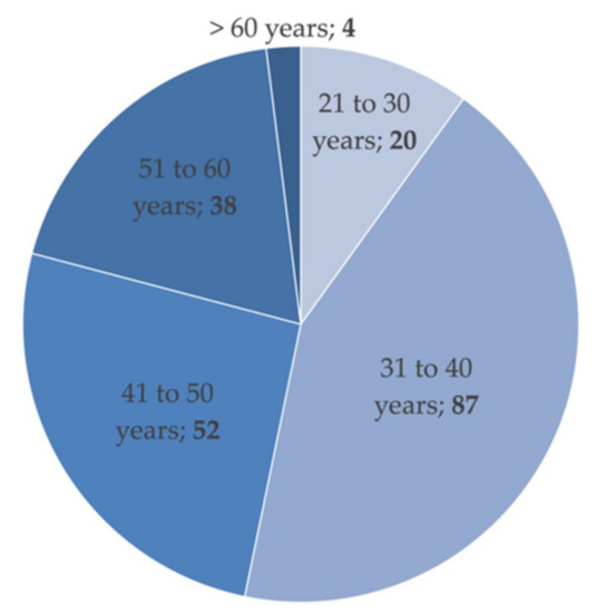 The sample consisted of n = 202 participants, of whom 23 (11.4%) were female and 177 (87.6%) were male, while 2 did not indicate their sex. The age distribution is shown in Figure 3.