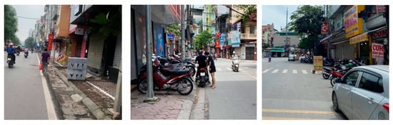 Pedestrians are the most vulnerable road users who are more likely to suffer from more severe injuries in bus-involved crashes, especially compared to motorcycle riders [,,,]. This study confirms the aforementioned conclusion through the negative coefficients for motorcycles (coef = −0.589, p = 0.096) and others (coef = −0.663, p = 0.065); however, these effects are weak at the 0.1 level of significance. This result would stem from the unsafe behaviors of some pedestrians and the poor provision of walking infrastructure (Figure 1). Notably, this finding is in disagreement with [], identifying that vehicle-pedestrian crashes are more likely to be less severe than vehicle-vehicle ones. The reason would be that the 2020 research studies buses running on expressways limiting the access of pedestrians. Additionally, the classification of the severity, in this case considers, both the cost of damage and the loss of lives. Therefore, most collisions involved in pedestrians and no death are less severe than vehicle-vehicle crashes. Similarly, the involvement of a motor vehicle relative to a pedestrian increases the risk of higher severity [].