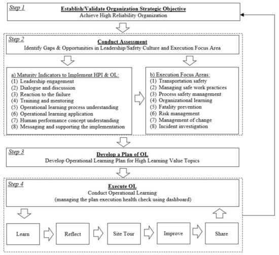 This study delivered a streamlined implementation framework for HPI as a strategic initiative and for OL implementation as either tactical or operational practices that are fully integrated into the management system cycle. The proposed framework provides significant improvement over previous studies that developed an individual framework for Learning Teams [12], OL [11,22], and human organizational performance [7,21]. Furthermore, companies or organizations seeking a simple way to implement HPI and OL can adopt the proposed implementation framework. This study provided generic references and steps incorporated into other management systems, i.e., International Standard Organization 45001 and International Standard Organization 9001. We also identified critical roles, responsibilities, and requirements as the benchmarks of the organizational capability of becoming a high reliability organization.