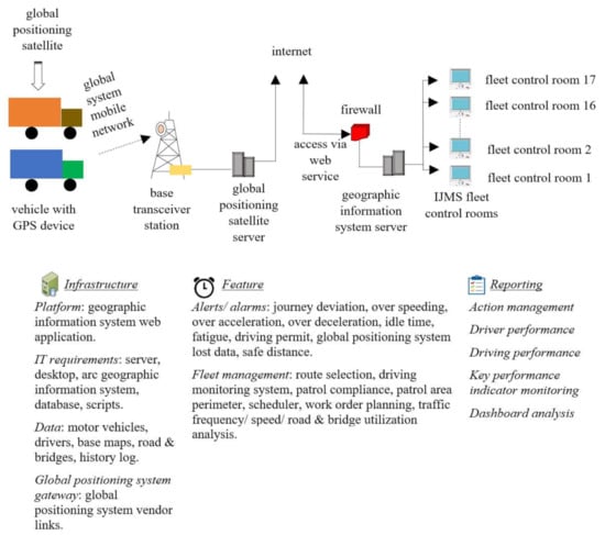 The IJMS framework consists of infrastructure, features, and reporting. Infrastructures are related to the platform, infrastructure technology requirements, data, and a global positioning system gateway. Features are alert/alarm and fleet management. Reporting is related to action management, data analysis, and key performance indicator monitoring. Likewise, typically, vehicles are equipped with the global positioning system device functioning as a signal receiver of the global positioning system satellite and the global system mobile transmitting to the commercial telecommunication network. Meanwhile, the global positioning system server is connected through an Internet web service to the firewall and geographic information system server. Hence, each fleet control room can access the geographic information system web application. Figure 3 illustrates the IJMS’s framework of the studied company.