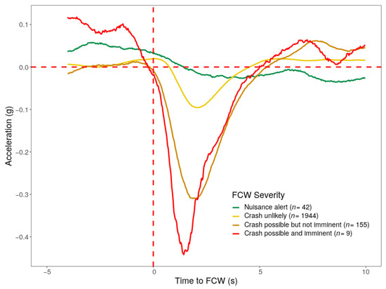 Average acceleration by rated severity during FCW epochs. The dashed vertical line indicates onset of FCW issuance. The dashed horizontal line indicates 0 average acceleration.